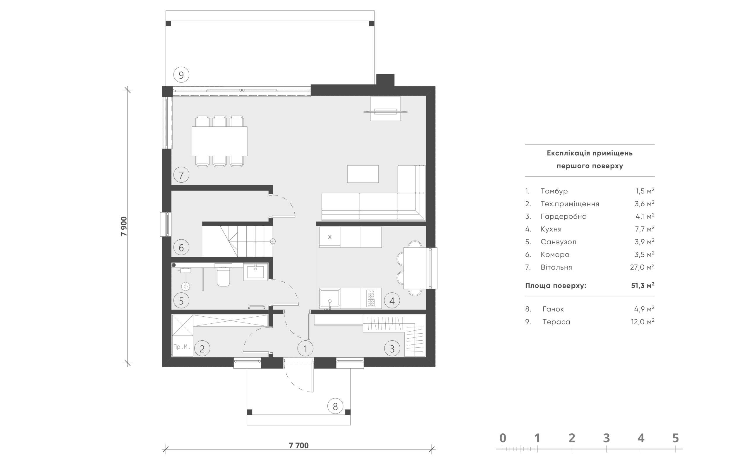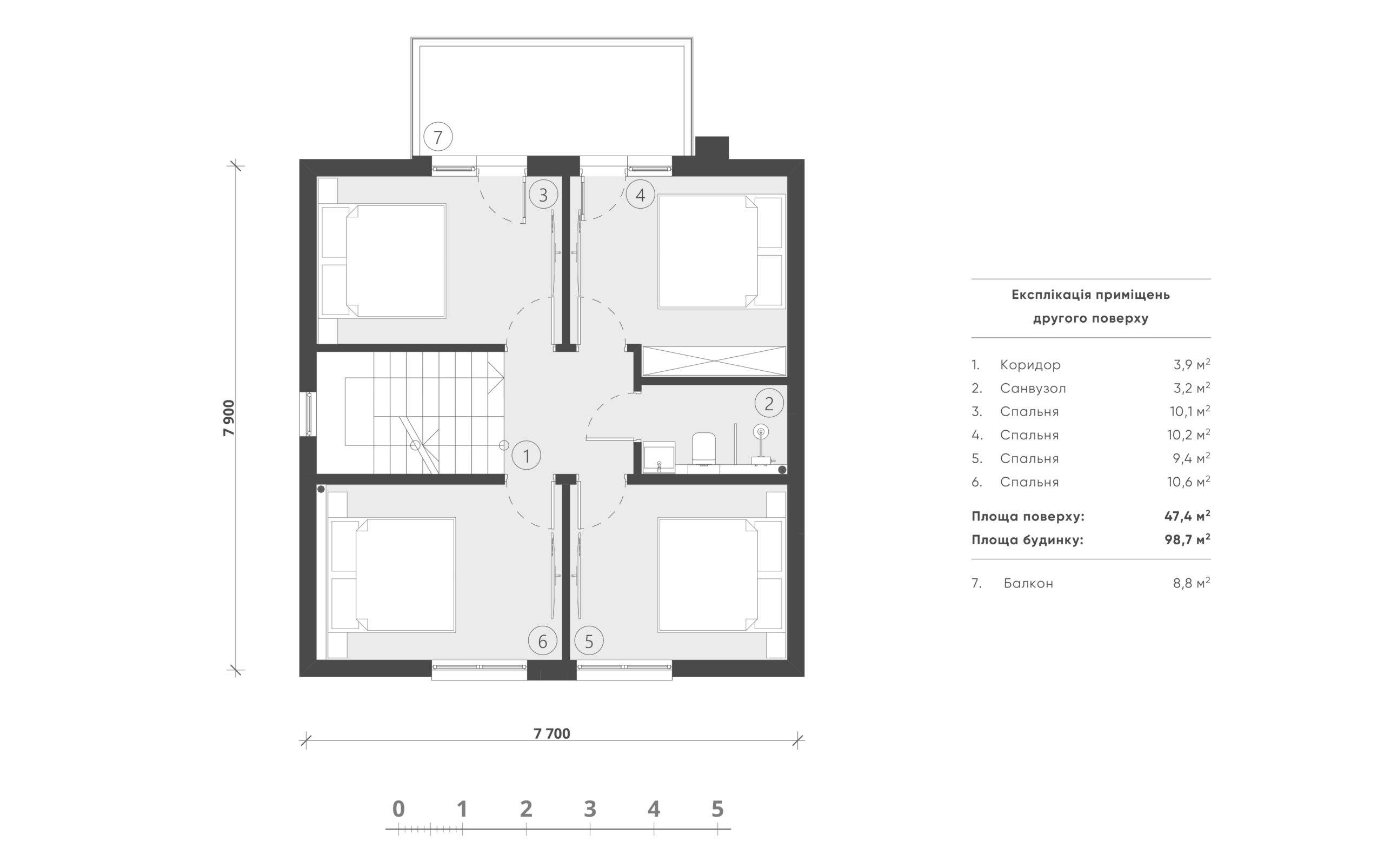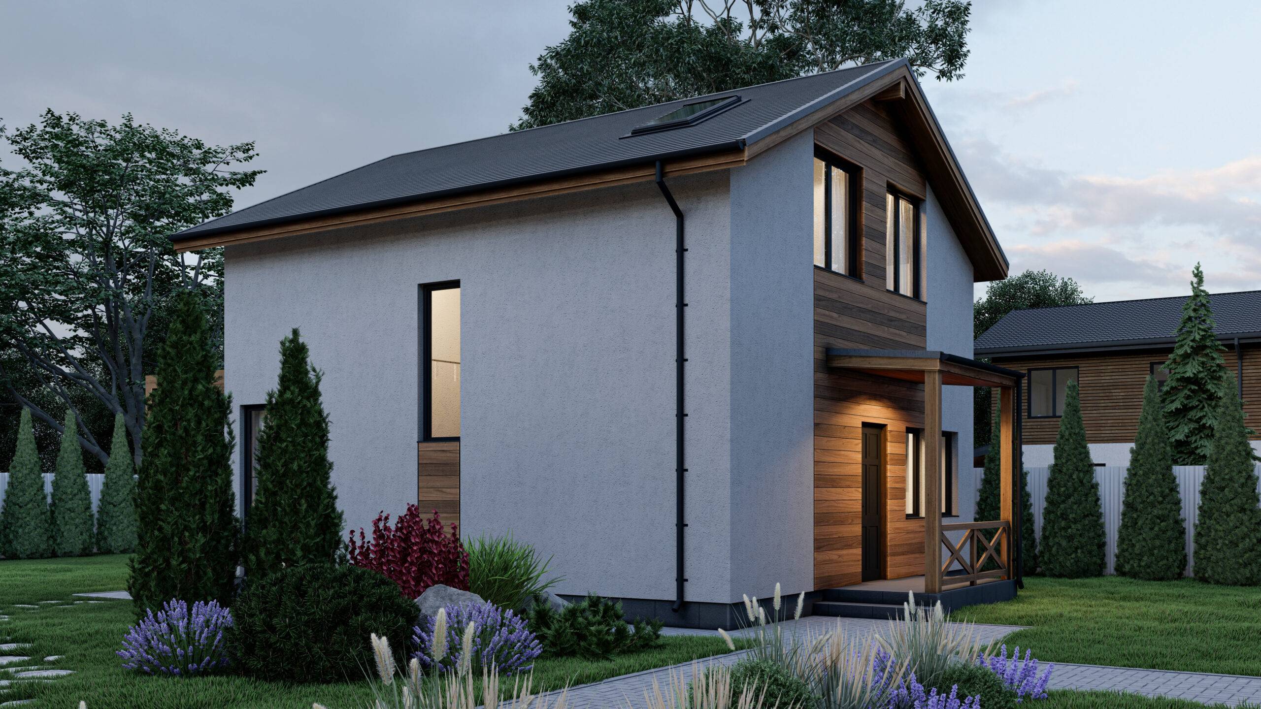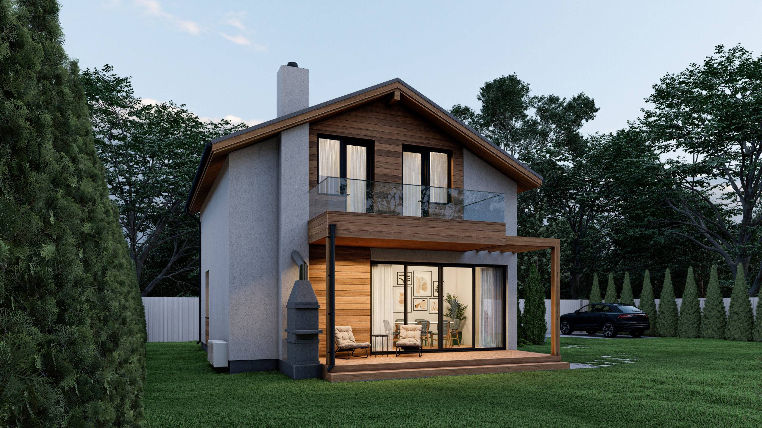 The house contains all the necessary areas for a comfortable stay. On the first floor there is an entrance area, tech. room (3.6 m2), dressing room (4.1 m2), bathroom (3.9 m2), pantry (3.5 m2), compact kitchen (7.7 m2) and a spacious living room (27 m2) with a fireplace and exit to the open terrace. The second floor accommodates an entrance hall (3.9 m2), a bathroom (3.2 m2), two children’s rooms of 10.2 m2 each with their own access to the balcony (8.8 m2) and two bedrooms (9.4 and 10.6 m2 ). The decoration of the facade combines plaster and wood, the roof is made of bituminous tiles. A successful combination of materials gives the house an original appearance.