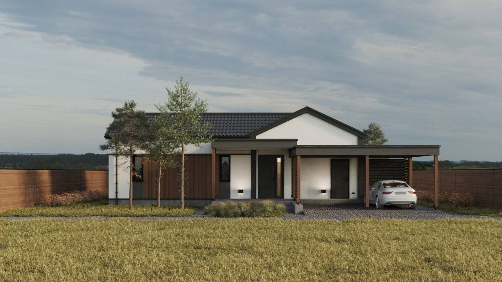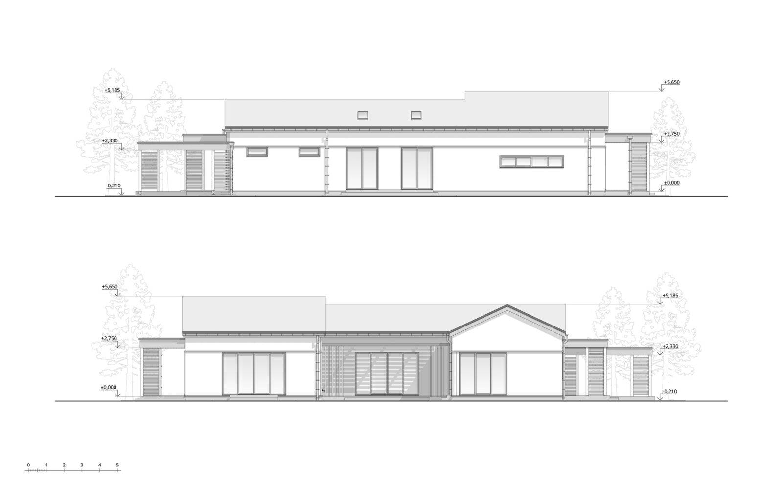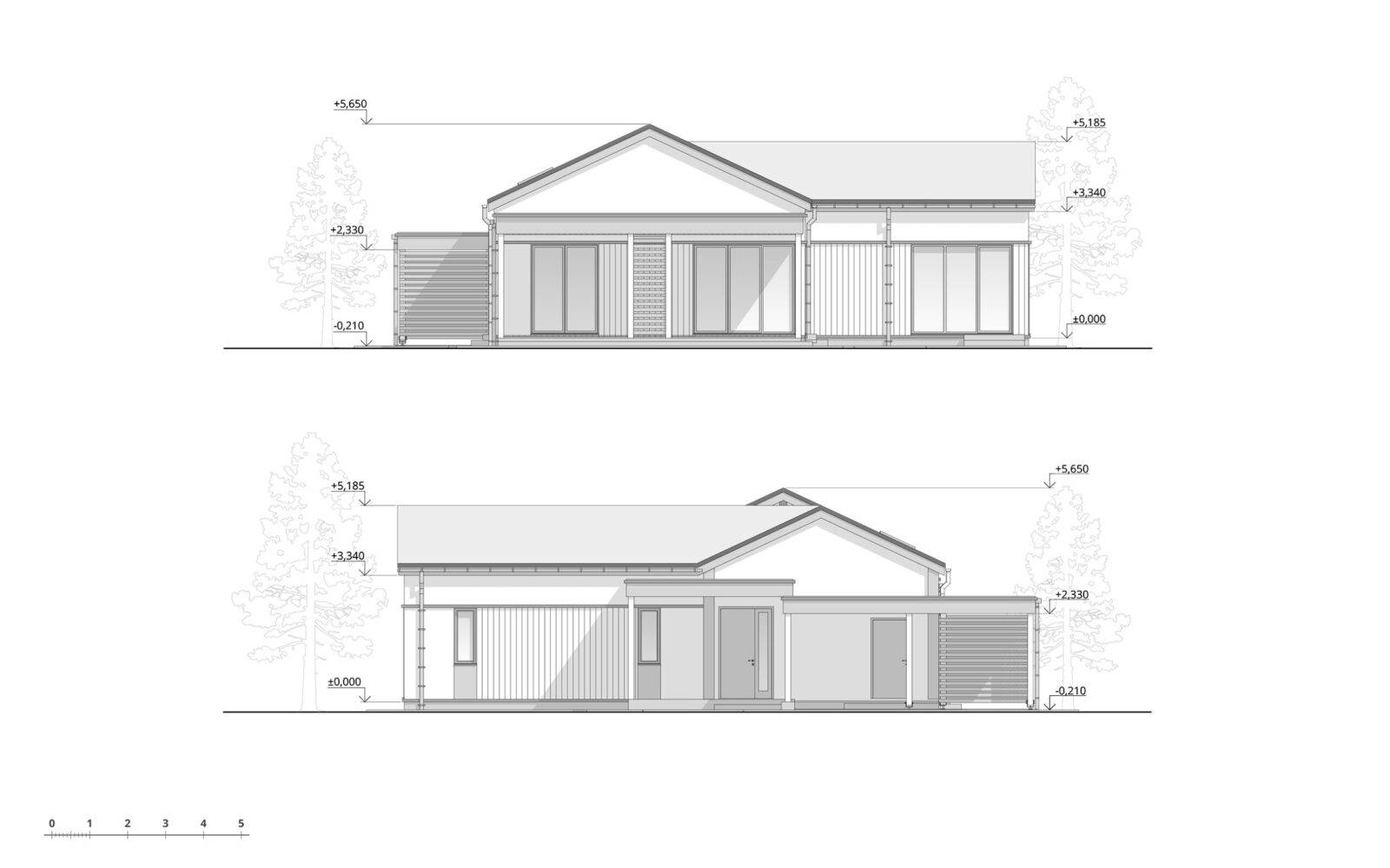 Technical facilities and a shed for two cars were placed along the road, thus we created a comfortable space in the yard and two terraces (34 square meters).