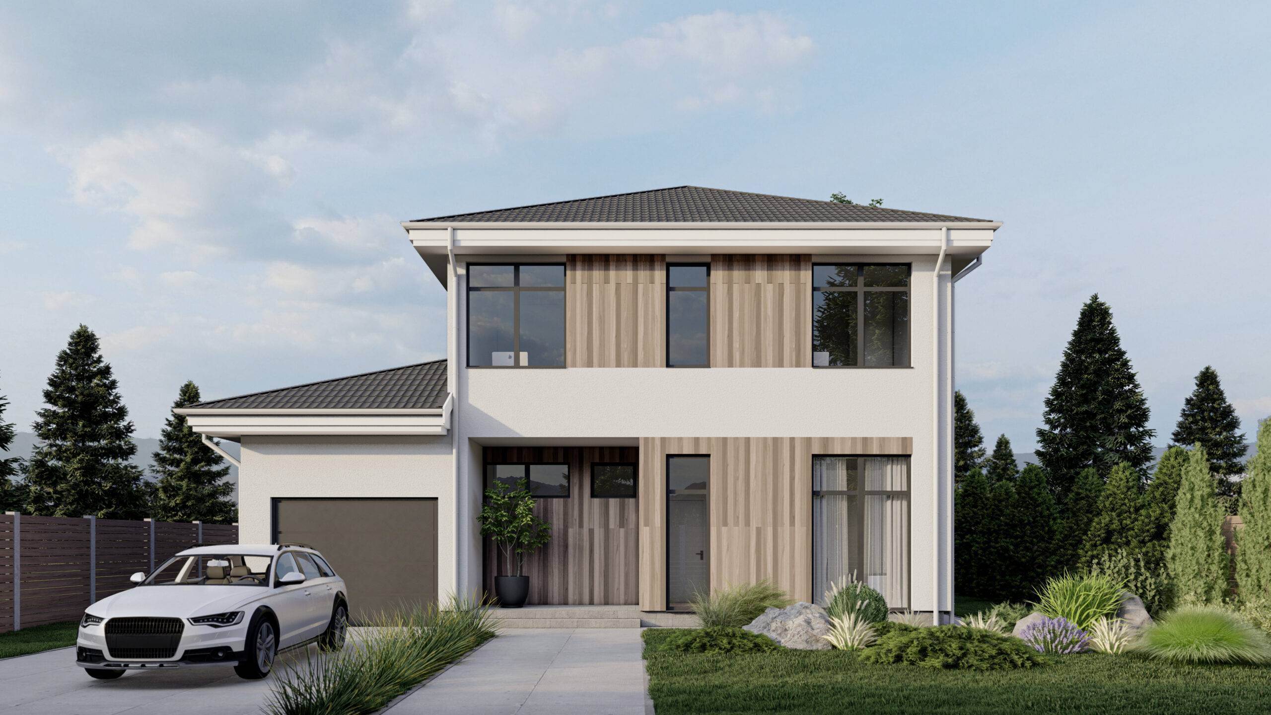 This project has a clear modern facade shape. Its innovativeness is in refined, slender and proportional lines. Another advantage is the presence of a large terrace and a covered balcony on the second floor.