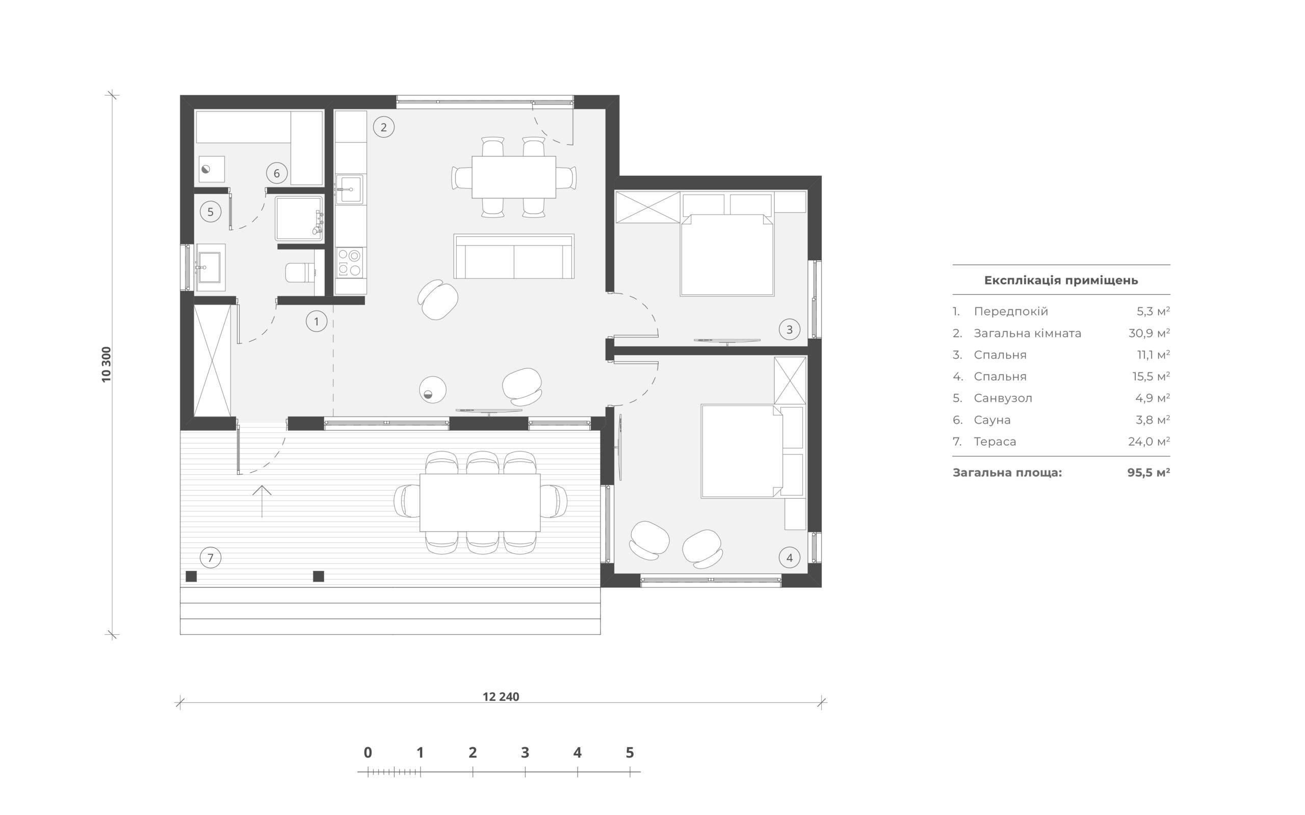 The total area of the building is 95.5 square meters